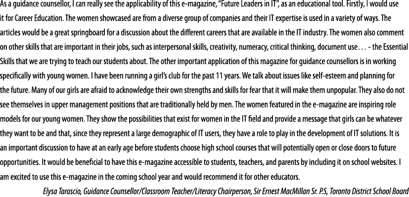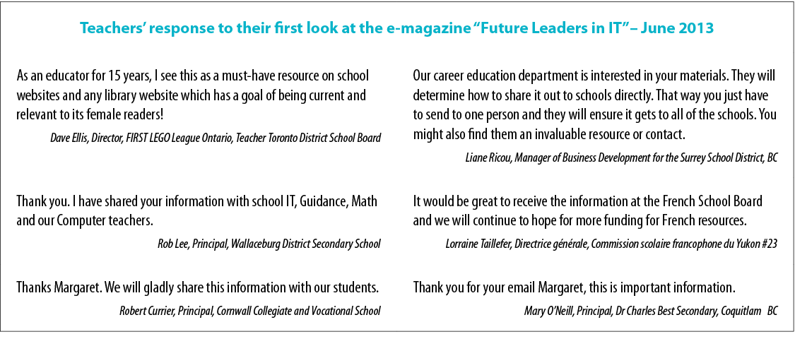 In June 2013 before sending out a mass email to teachers across Canada with a link to the e-magazine, the guidance counsellor who had assisted, was asked to critique the final product, “Future Leaders in IT”.
