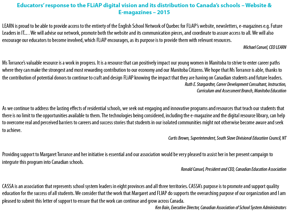 A name was chosen FLiAP (Future Leaders in All Professions) with the tagline “Empowering the next generation”, the Logo and branding were created, a pilot website built, marketing material designed and a charity trustee found. The trustee would allow us: to apply for funding from foundations and governments; to continue creating and growing; and to apply for charitable status. It is a long journey, but the girls and the educators couldn’t wait – neither could the Canadian economy. A lot of door-knocking started. As opposed to knocking on every school door, Educational Ministries, organization, Superintendents… were approached. And the response was amazing.