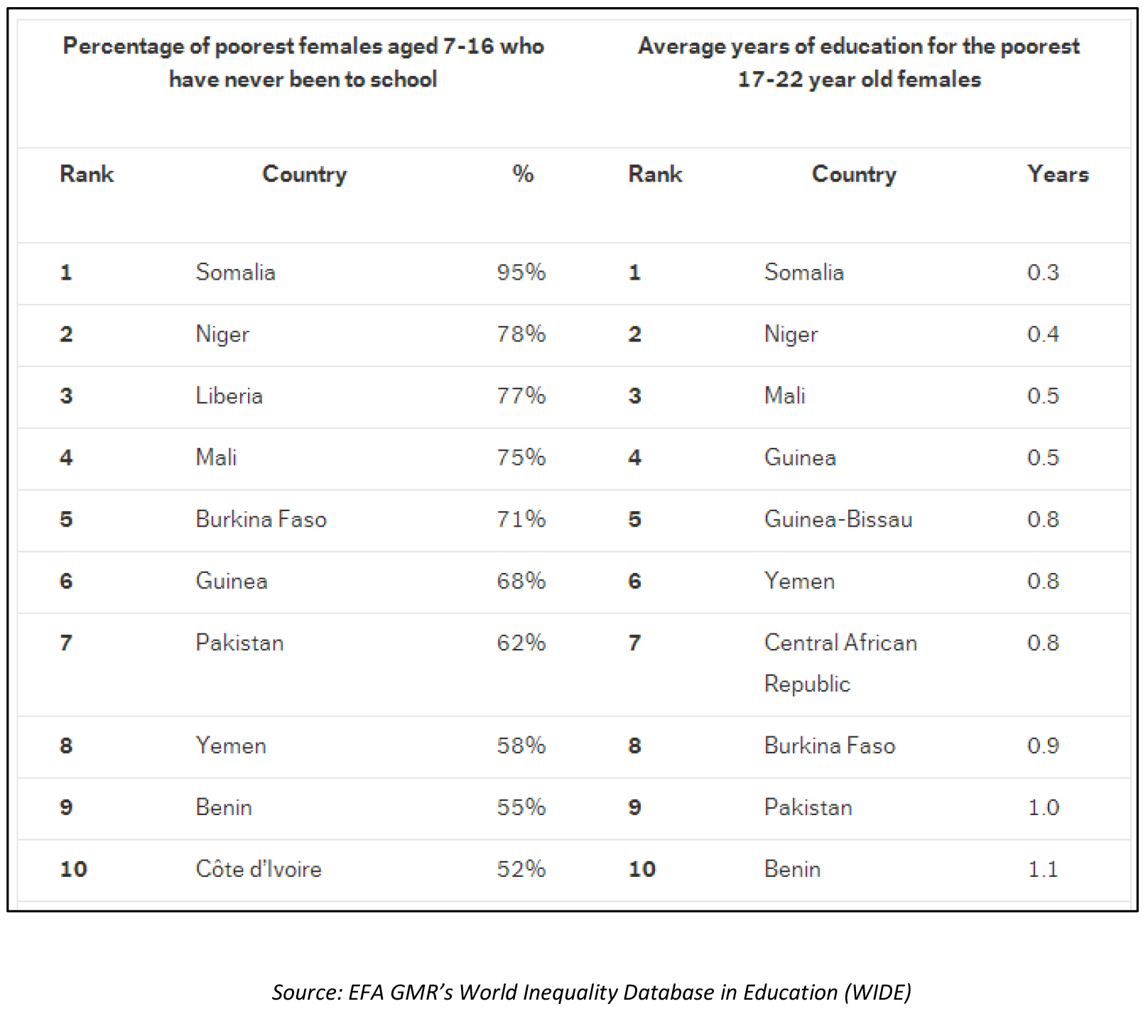 The bottom ten countries for female education